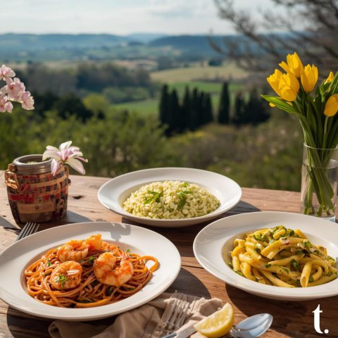 V dubnu jsme se rozhodli propojit svěžest jarních bylinek s naší poctivou italsko-českou fúzí. Absolutním hitem sezóny je čerstvý medvědí česnek, který najdete hned ve dvou těstovinových specialitách – na domácích špagetách s krevetami nebo ve vegetariánské verzi s penne a citronem.